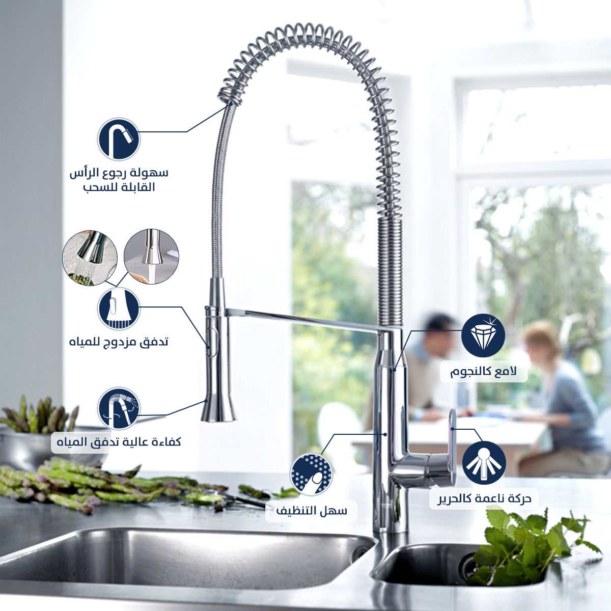 يساعد الخلاط في الطهي من خلال حركة رقبة الخلاط القابلة للدوران 360 درجة و المرشة القابلة للسحب وتغيير نمط تدفق الماء
